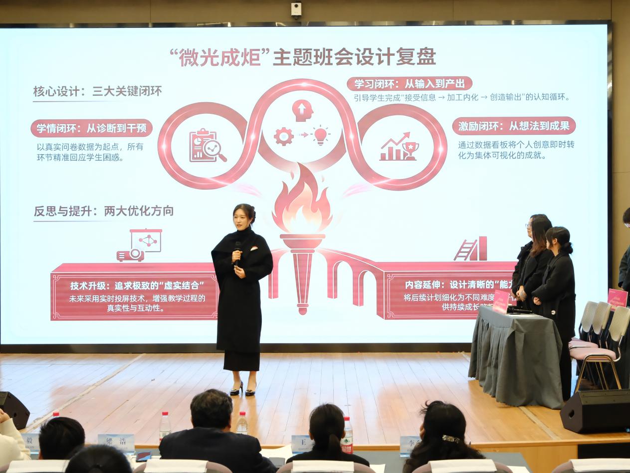 校党委副书记王科在总结讲话中指出,本次展示活动主旨鲜明、亮点纷呈,参赛辅导员通过精心策划与巧妙构思,聚焦专业特色,以小切口解读大道理,为我们呈现出一场场既有时代热度、思想深度,又有实践浓度、情感温度的主题班会。同时,面对当前新时代大学生思想活跃、需求多元的特点,他对全体辅导员提出三点希望:一要守牢思想阵地,让主题班会有“魂”;二要贴近学生实际,让主题班会有“情”;三要坚持创新赋能,让主题班会有“力”。学校将持续聚焦辅导员专业技能和核心素养提升,为辅导员队伍专业化、职业化发展提供多元化平台,助推学校学生思想政治工作高质量向前发展。