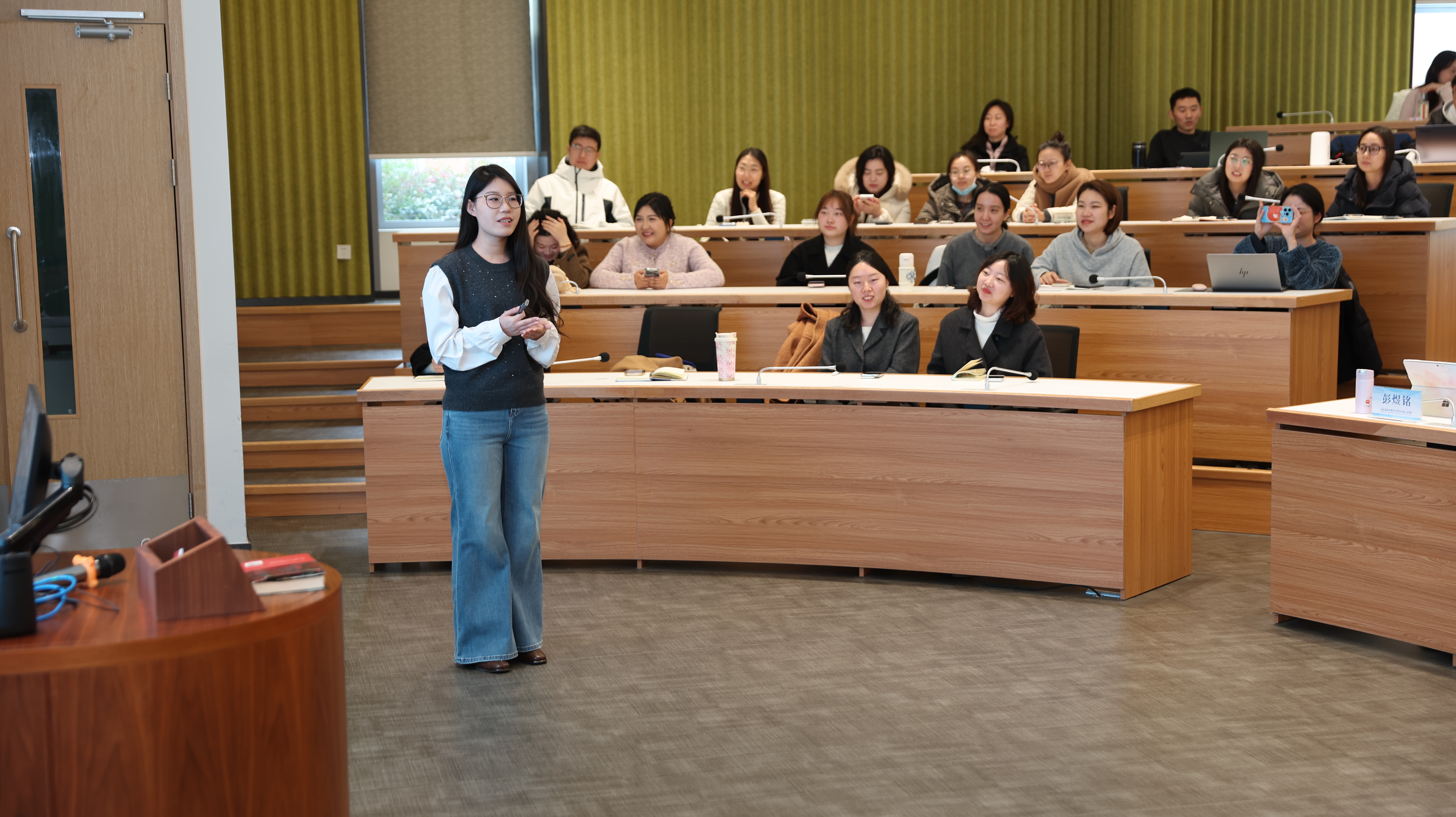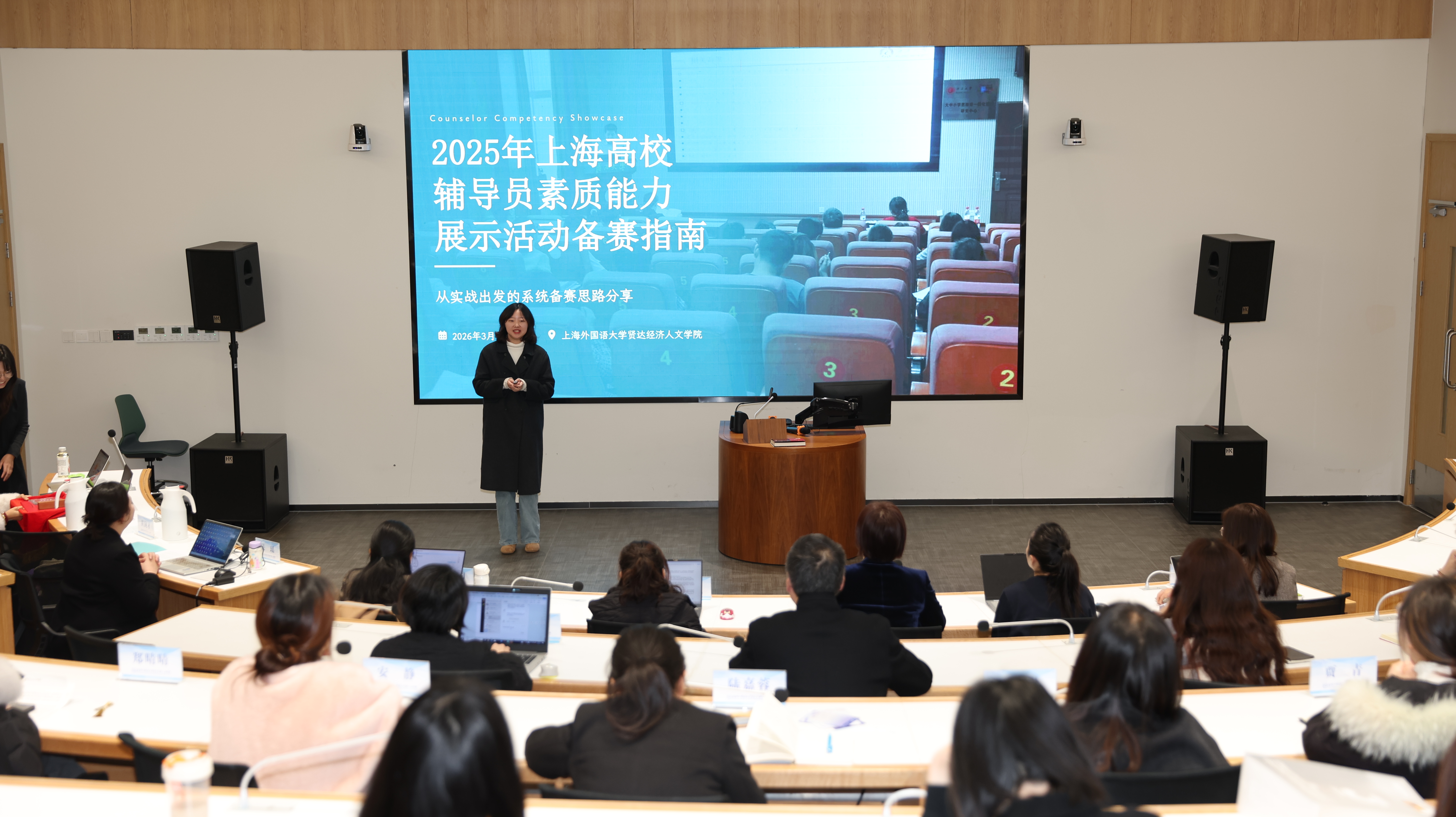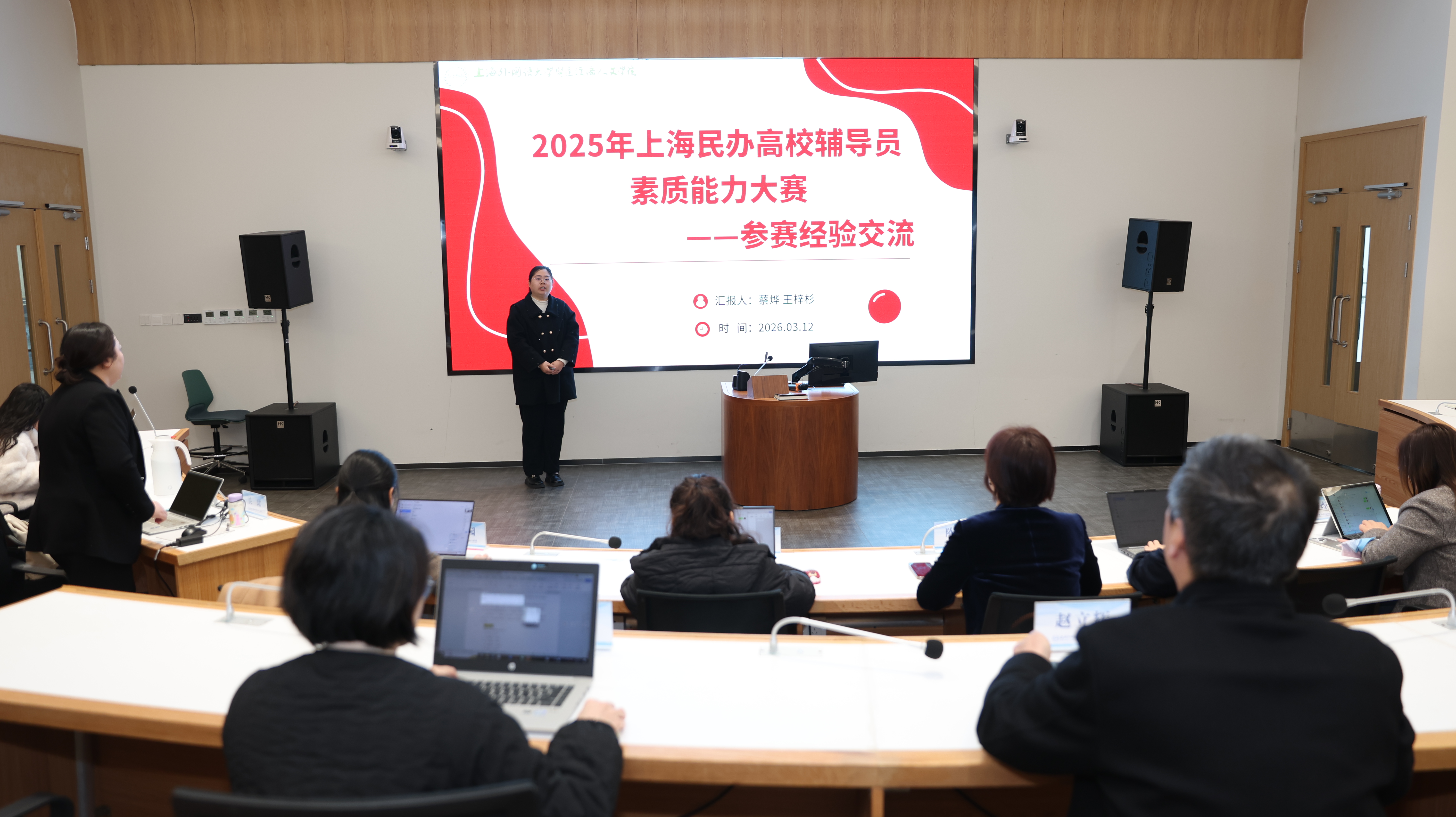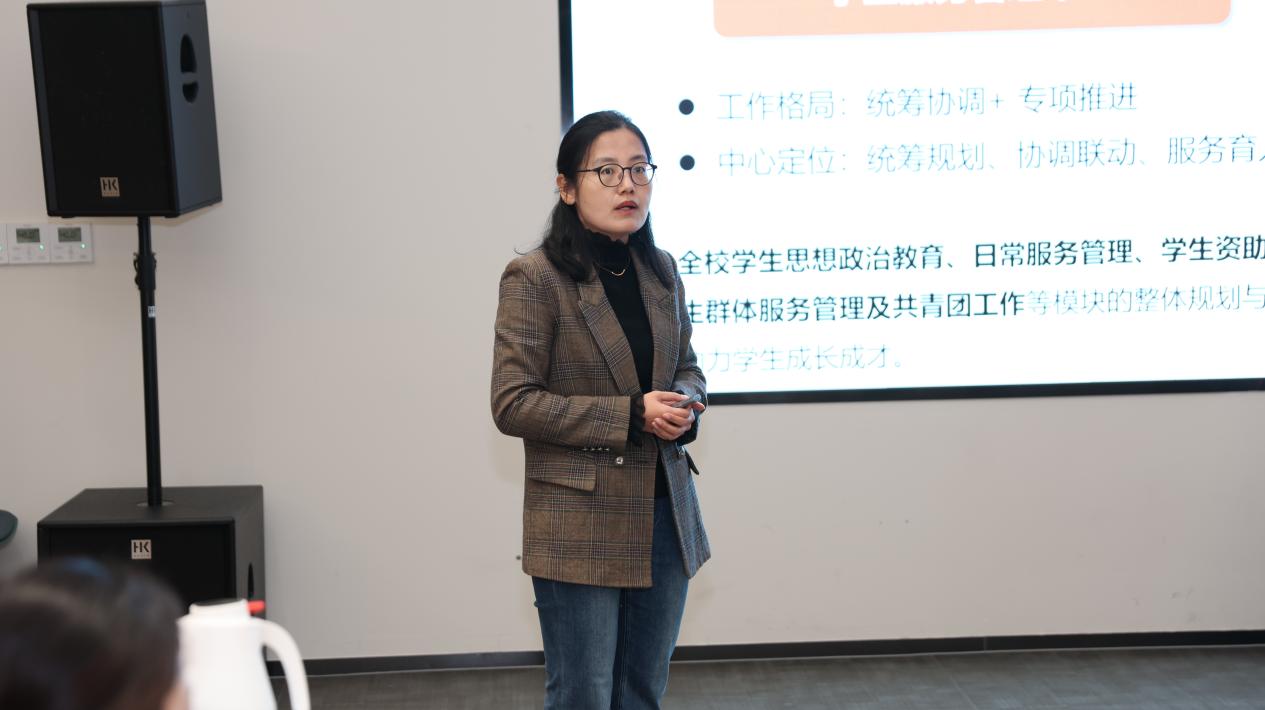 在经验分享环节,在2025年市级辅导员职业能力赛事中取得突破的辅导员代表依次登台,分享了她们的备赛历程与心得体会。外语学院蔡烨老师、数据科学学院王梓杉老师结合参加上海市民办高校辅导员大赛的经历,从理论学习、案例研讨、谈心谈话技巧等方面,详细讲述了备考策略与实战感悟。