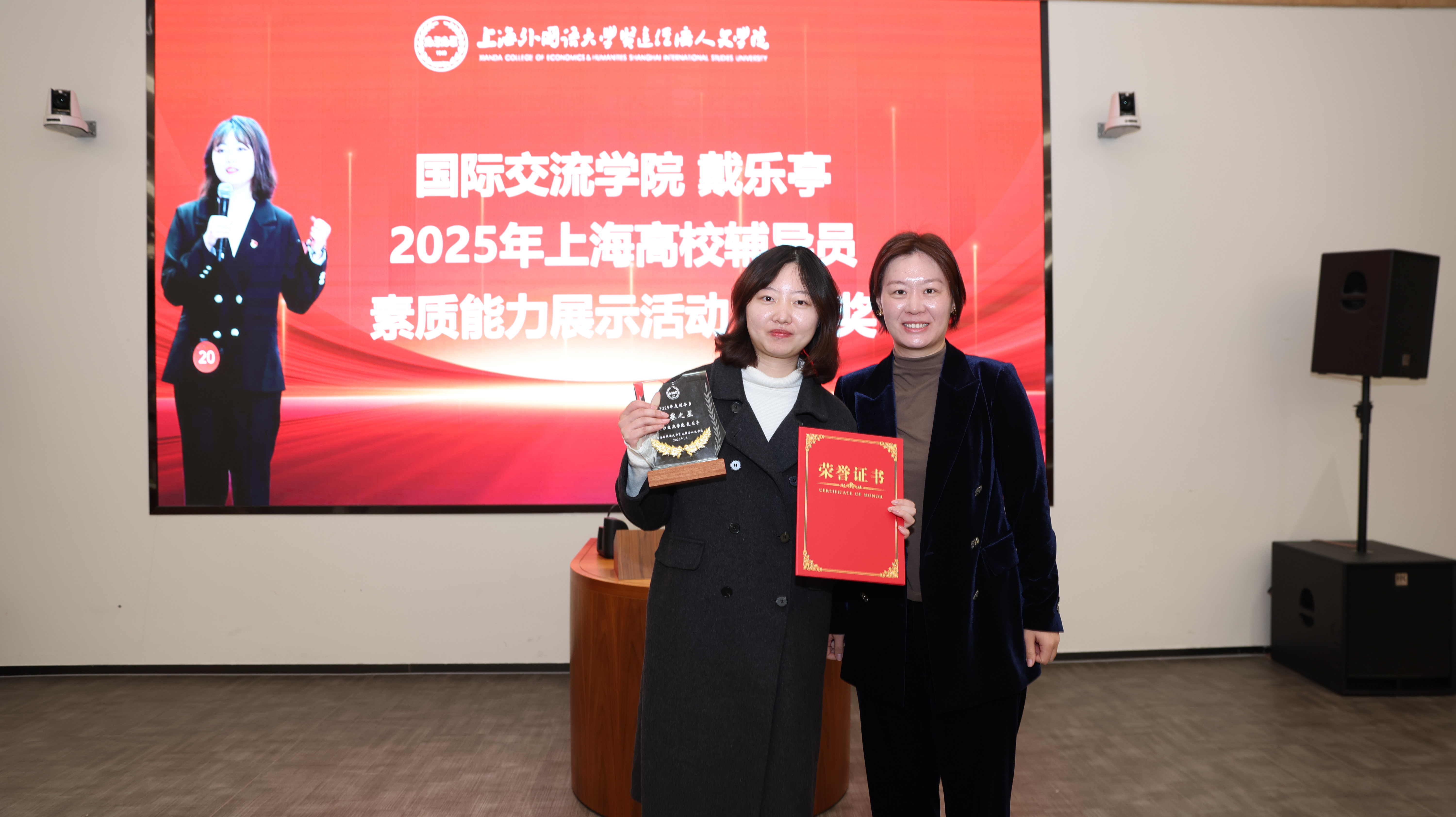 为充分发挥先进典型的示范引领作用,激励辅导员队伍见贤思齐、砥砺奋进,本次大会向在上海高校辅导员素质能力展示活动中斩获二等奖的戴乐亭老师进行表彰,陈应副校长为其颁发奖杯和荣誉证书,全场响起热烈掌声。